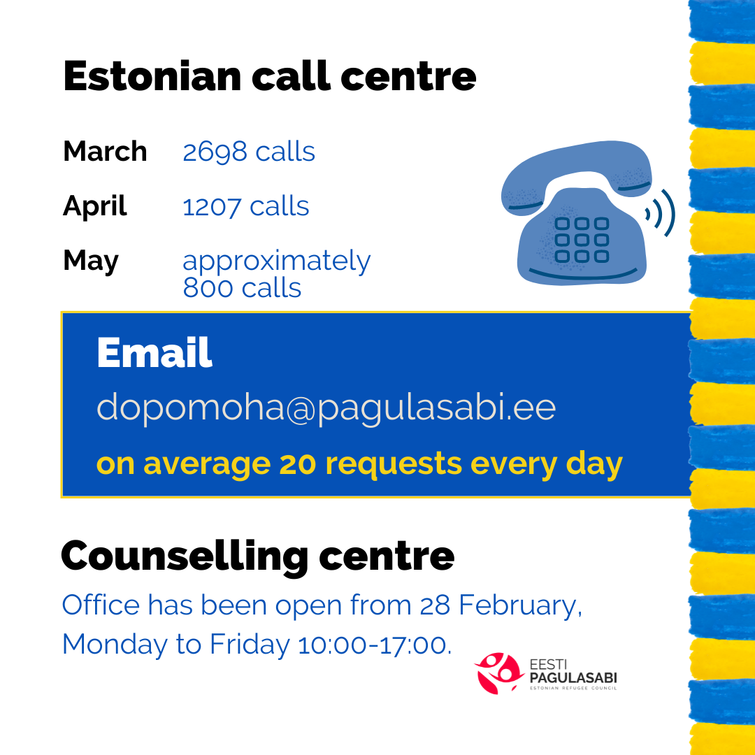 In March, we opened an Estonian call centre, as the number of inquiries increased to hundreds of calls per hour in the first days. We received 2,698 calls in March, 1,207 in April, and the number of calls in May reached approximately 800 for the month. The call centre has been open every day from Monday to Sunday with the support of volunteers.