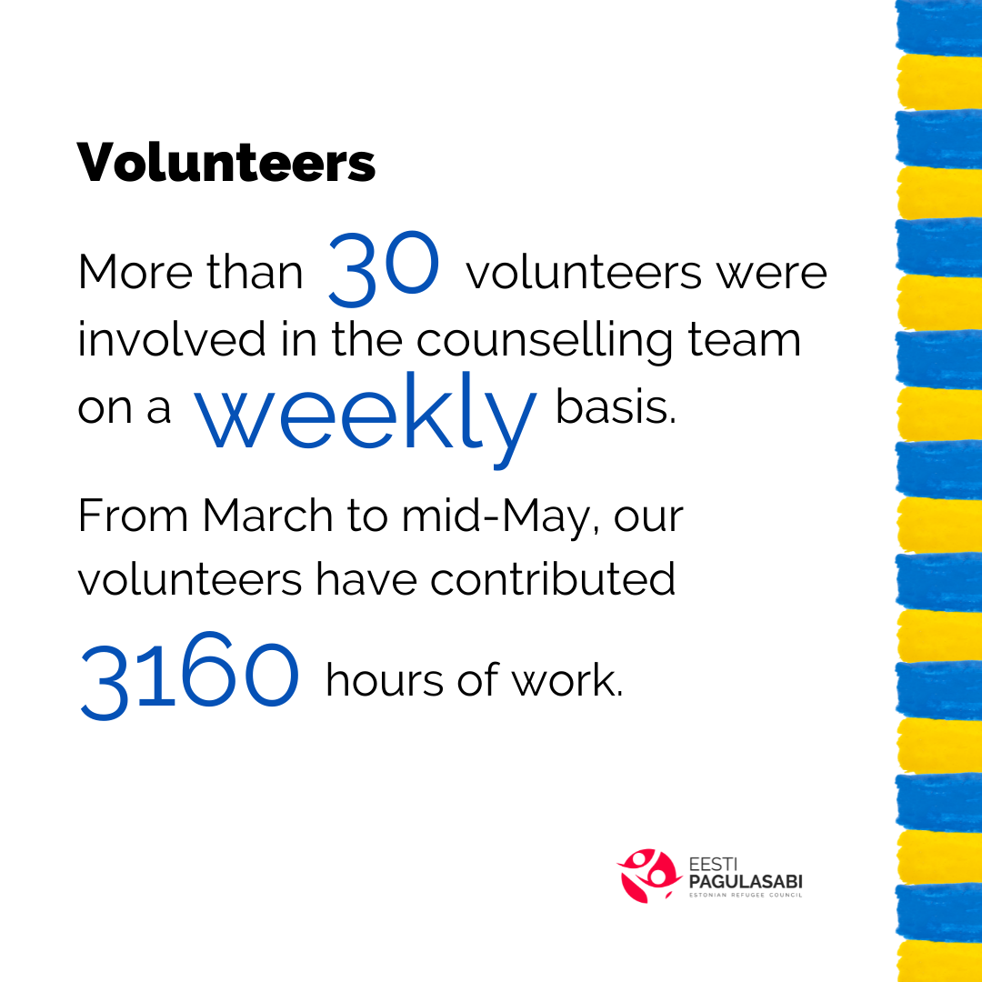 To support the Ukrainian refugees, we quickly included new volunteers. During the first weeks, more than 30 volunteers were involved in the counselling team on a weekly basis. They all wished to make the adaptation of war refugees arriving in Estonia as smooth and safe as possible. All our volunteers were given the opportunity to improve their knowledge and skills to provide psychosocial support, they learned to recognise the risks of human trafficking and acquired a considerable amount of important information to guide those in need.