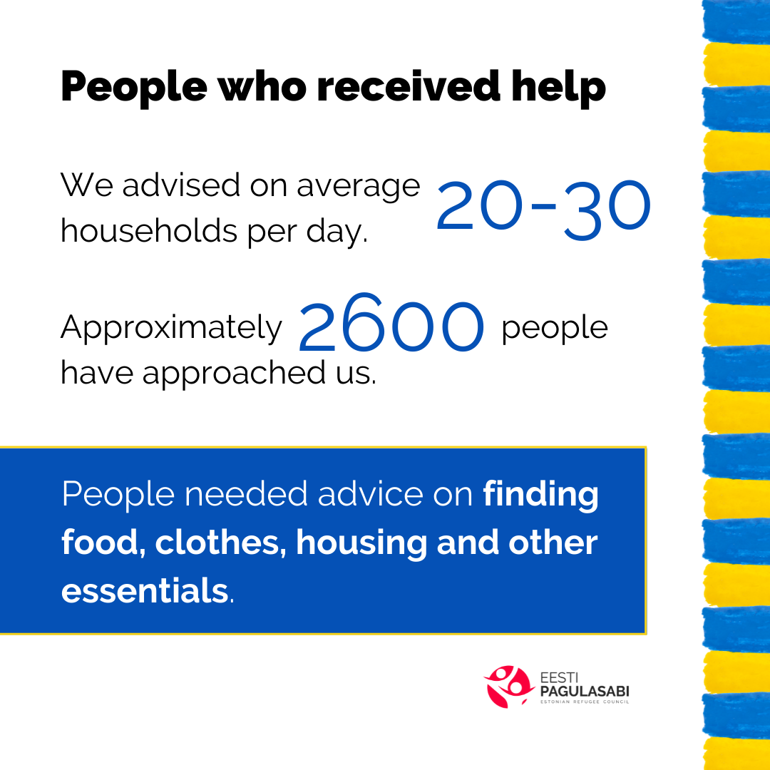Until the second half of April, an average of 20–30 households turned to the Estonian Refugee Council for advice on finding food, clothes, housing and other essentials. It is estimated that approximately 2,600 people, or about a quarter of the refugees who have arrived in Tallinn, have approached us.