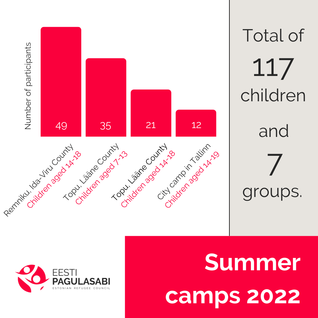 • During the summer, we conducted five camps, in which a total of 117 children with a refugee background took part. Four overnight camps were held: three camps in Topu in Lääne County (two camps with a total of 35 participants aged 7-13 and one camp with 21 participants aged 14-18) and one in Remnik in Ida-Viru County (49 participants aged 14-18). 12 children aged 14-19 participated in the city camp in Tallinn. We are also planning joint activities in the fall with the purpose to offer young people opportunities to create friendships and get to know Estonia.
