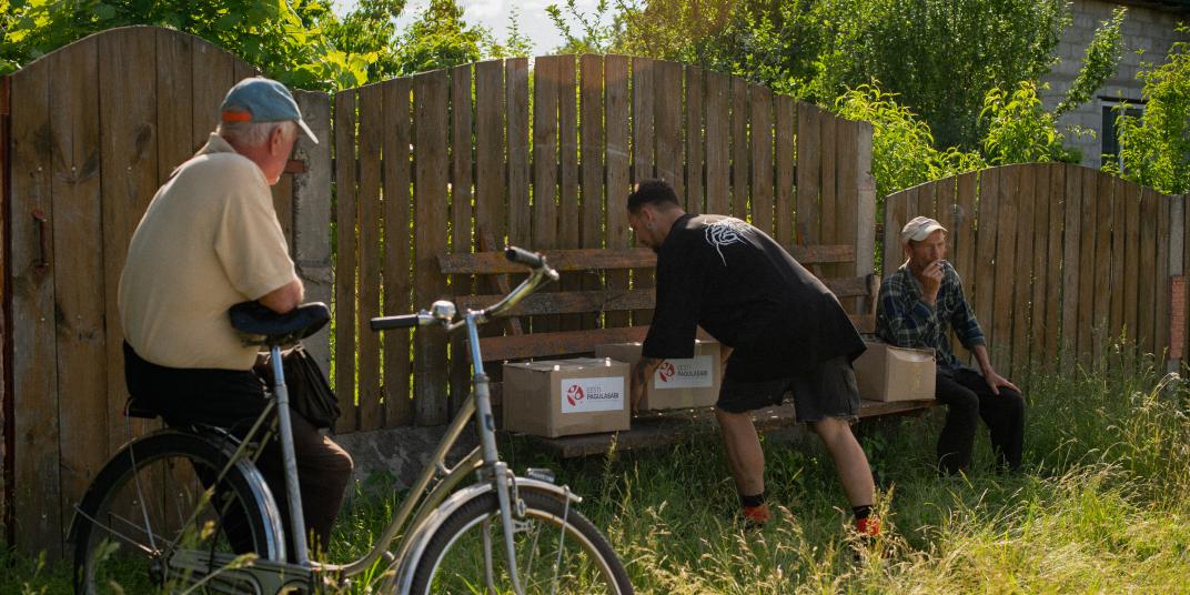Foto: Hlib Stoiko, toidupakkide jagamine Kiievi oblastide külades