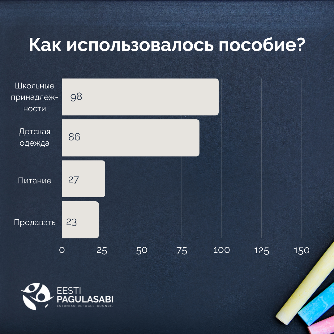 Весной мы увидели, что беженцам, прибывшим в Эстонию, может оказаться непосильным, плюс ко всему необходимому, покупать школьные принадлежности или одежду для детей, которые здесь начинают или продолжают учебу. С помощью хороших доноров мы решили выдавать одноразовую школьную денежную помощь.
